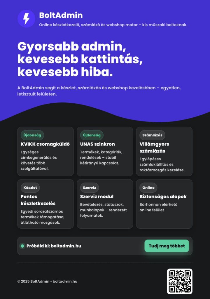 A BoltAdmin egyik legnagyobb előnye a felhasználóbarát felület. Mivel a szoftvert valós üzleti környezetben, a mi szervizünk és boltunk napi igényei alapján fejlesztettük, pontosan tudjuk, mire van szükséged. Ezért a rendszer:
