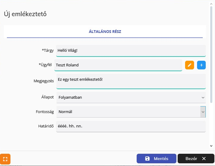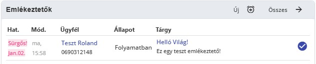 ADMIN > Emlékeztetők menüpont alatt van lehetőségünk emlékeztetőket létrehozni vagy a Főoldalon az „Emlékeztetők” részben az „Új” gombra kattintva.